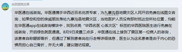 地震发生后,成都大学附属医院派驻九寨沟县人民医院支医的专家立即响应,迅速投入到伤员救治工作中。8日,22时1分,成都大学附属医院骨科专家主任医师员晋教授,接诊了第一例地震伤员。