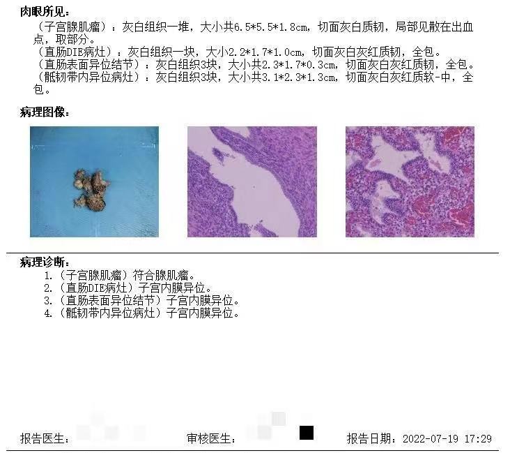 全身麻醉下行腹腔镜子宫腺肌瘤挖除术+骶韧带及直肠深部子宫内膜异位病灶切除术+直肠修补术+肠粘连松解术。
