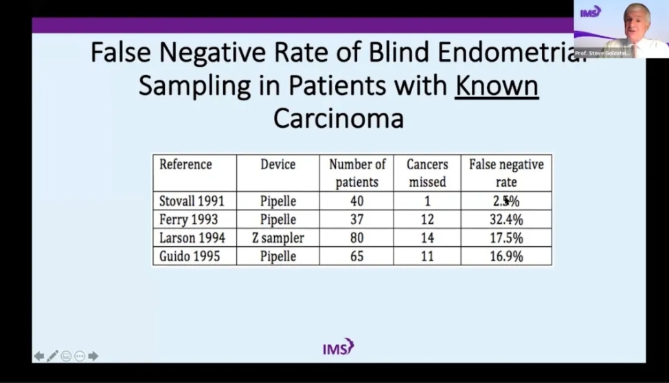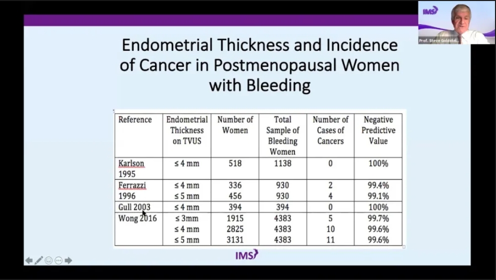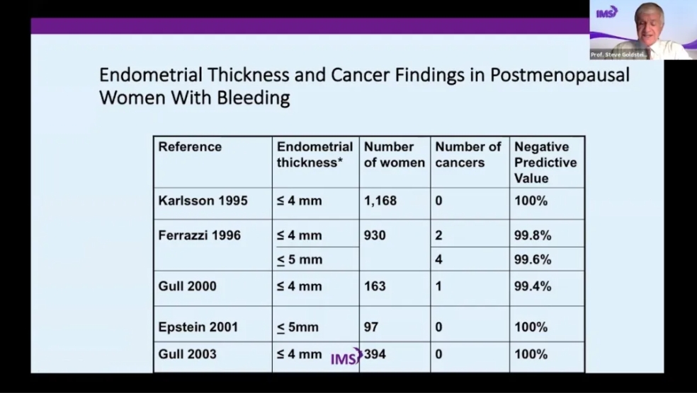 在早期观察性研究中,Steve Goldstein 于1990年首次报道了超声内膜为7mm,被认为是最薄内膜的子宫内膜癌1。此后相继有很多学者参与到子宫内膜厚度与子宫内膜癌相关性的研究中。以Steve Goldstein 教授多年的临床经验,最常见的增厚的子宫内膜常出现在子宫内膜息肉和单纯性增生中。那么,经阴道超声是否能预测哪些患者缺乏足够的内膜组织,可以避免进一步行子宫内膜诊刮或活检?