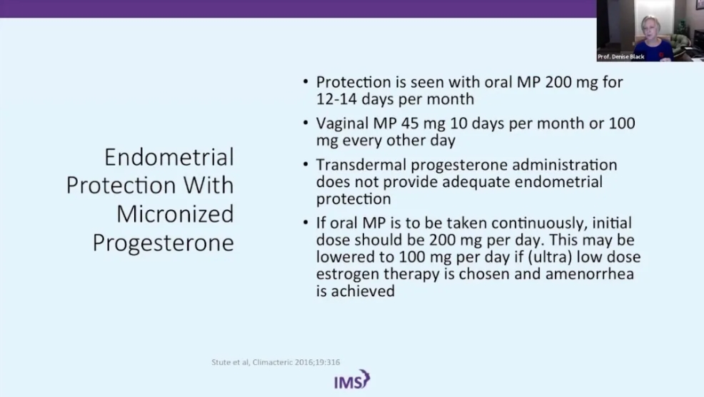 一项来自法国历时8年,纳入80000名妇女的E3N研究显示应用雌激素和微粒化黄体酮增加子宫内膜癌的风险,而事实上该风险更常见于无对抗的雌激素应用,该研究缺乏应用微粒化黄体酮的剂量、方式(周期性或连续性)及依从性的相关数据13,且未对经皮雌激素联合口服微粒化黄体酮进行足够关注14。另一项最近的研究则证明口服17-β雌二醇1mg联合100mg微粒化黄体酮具有子宫内膜安全性15。
